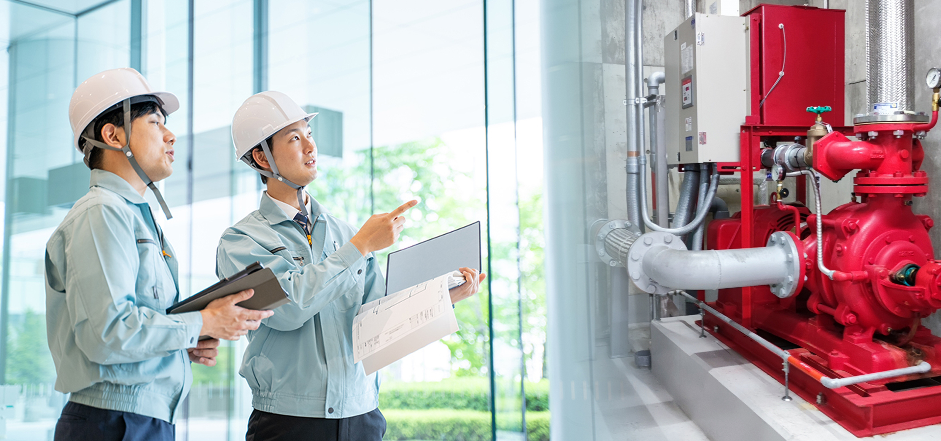 火災発生時に、防火区画、防煙区画に設けられる各機器(防火扉・防火シャッター・防火ダンパー・排煙口等)を有効に動作させ、火災の延焼と煙の伝播拡散を防止する防排煙設備や、屋内消火栓設備(人が操作することによって火災を消火する設備であり、水源、加圧送水装置、起動装置、屋内消火栓、配管・弁類及び非常電源等から構成されています)の設計から請負工事まで対応いたします。